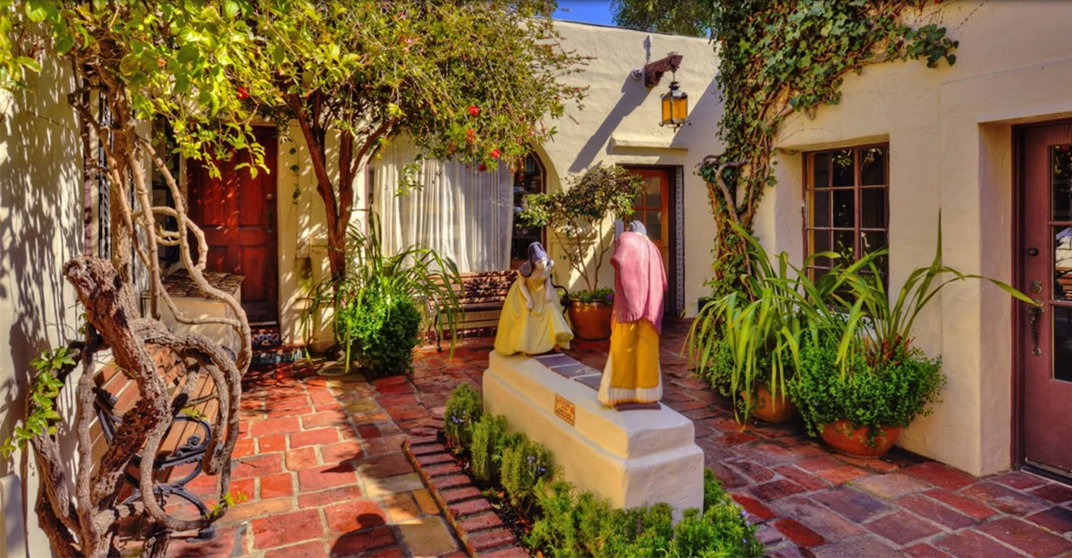Many of the tiles on these Mediterranean buildings came from Spain. The sculpture was done by Jo Mora in 1927, who also did the sarcophagus of Father Junipero Serra at the Carmel Mission.